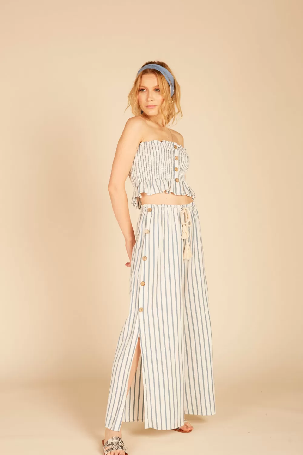 **FINAL SALE ITEM NOT ELIGIBLE FOR RETURN**The Smocked Button Tube Top features:Smocked bodiceButton down fontIvory/Bl…